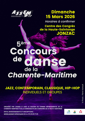 L'ASSEM 17, avec le soutien du Conseil Départemental de la Charente-Maritime et de la Communauté des Communes de la Haute Saintonge, organisera son 5ème Concours de Danse de la Charente-Maritime, également ouvert aux départements limitrophes, le dimanche 15 mars 2026 au Centre des Congrès de la Haute-Saintonge (JONZAC).