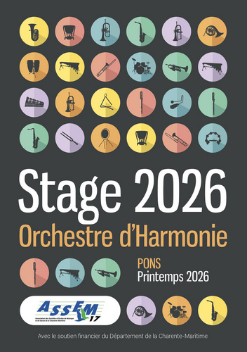 Avec le soutien du Département de la Charente-Maritime, l’ASSEM 17 et son collège Orchestres organisent son prochain stage d’orchestre d’harmonie du lundi 6 au vendredi 10 avril 2026 à Pons (Lycée Emile Combes) (1ère semaine des vacances scolaires de printemps – zone A).